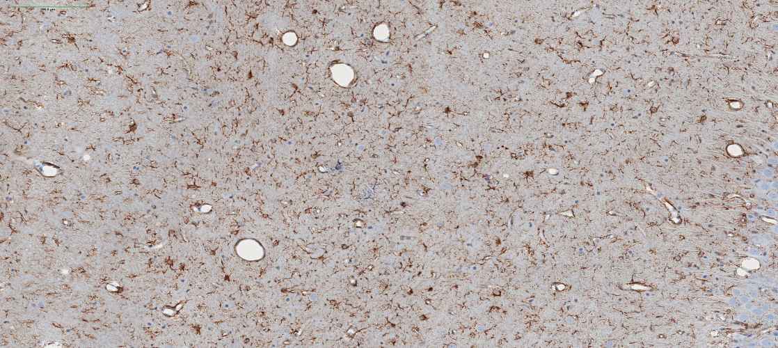 Image at top identifies astrocytes (brown) using a virtual glial fibrillary acidic protein or (GFAP).