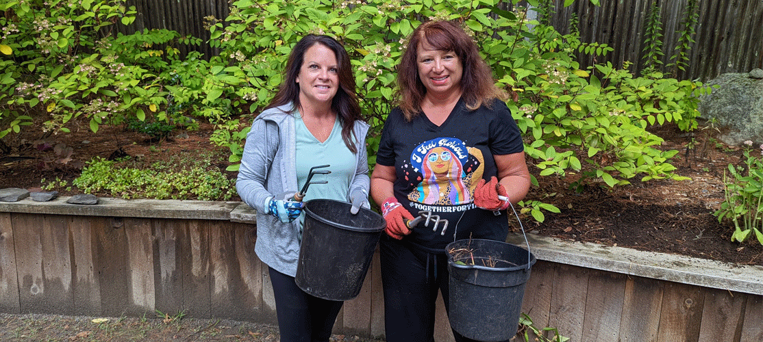 Three years ago, our usually virtual roundtable gathered in person at the Virginia Thurston Healing Garden Cancer Support Center in Harvard, MA. The Healing Garden, a beautiful facility located on eight acres of woodlands and gardens, provides a community of support for women affected by cancer. Roundtable members Susan Desmond and Nancy Sullivan, who were part of that 2019 roundtable, decided to return to the Healing Garden in September to spend an afternoon weeding the gardens that so many cancer patients find rejuvenating. As they were weeding, they uncovered a colorful stone, which might have been a crystal, buried in the dirt. Both wondered if it might have been put there by a patient who had gone out to the gardens to meditate. “It just really resonated with me, in terms of people using the space and the peace and comfort that they may get from these beautiful gardens,” says Susan, an 8 ½ year survivor. “So, it was a great experience.”