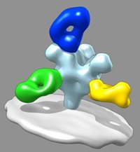 GP, VP40, VP35, VP30, VP24 and we are working on the remaining few. The GP structure gave us the roadmap to understanding how antibodies in the ZMapp serum work and how an even better serum can be made going forward. In the image shown at right you can see an example of our work. The GP is the light blue structure at the center shaped like a tulip or a tooth. The three antibodies are blue, green, and yellow. This is electron microscopy imaging done by Daniel Murin and Andrew Ward at TSRI. Andrew is an Assistant Professor and Daniel is a graduate student we co-mentor.