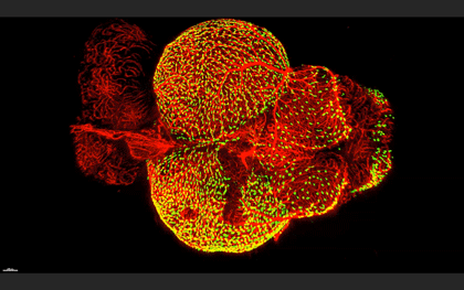 DC: This image shows that Fluorescent Granular Perithelial cells (FGPs, in green) are closely associated with the blood vessels (red) that surround an adult zebrafish’s brain. The FGPs are novel type of cell found in both zebrafish and mammals, and researchers suspect that they play a key role in maintaining the blood–brain barrier and clearing toxic substances from the brain.