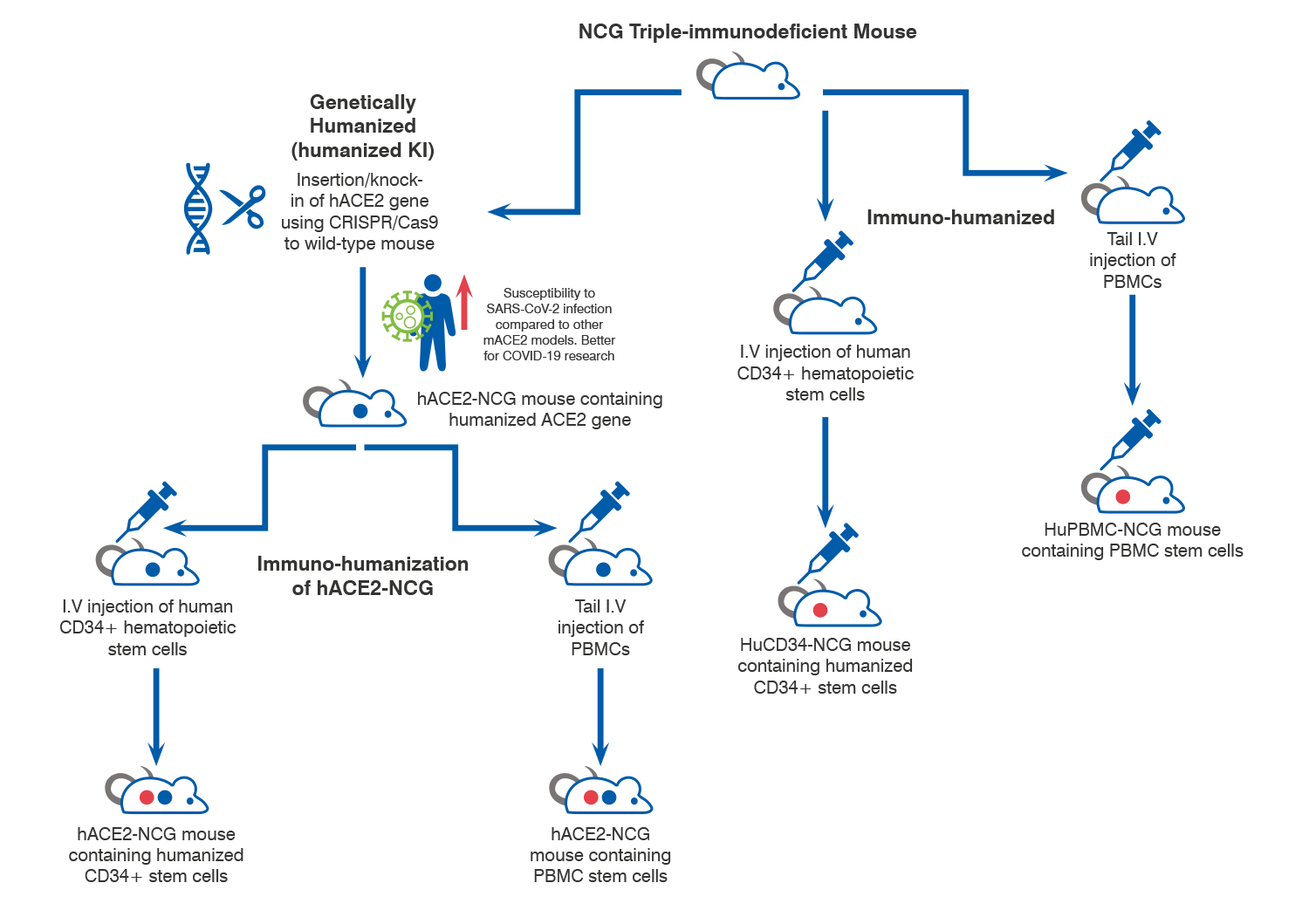 - Pre-humanized CD34+ and PBMC NCG mice